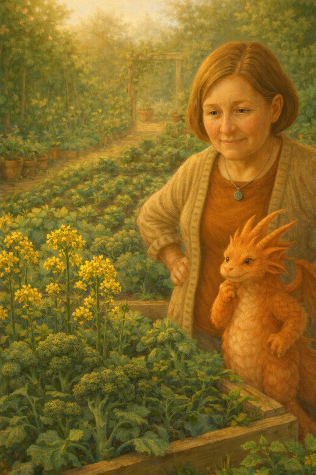 Biscuit and I were looking at the vegetable patch in the back garden. I stood with my hands on my hips and my head tilted to one side. Biscuit flapped his wings beside me and hovered at shoulder height, his little scaly face tilted in the opposite direction.